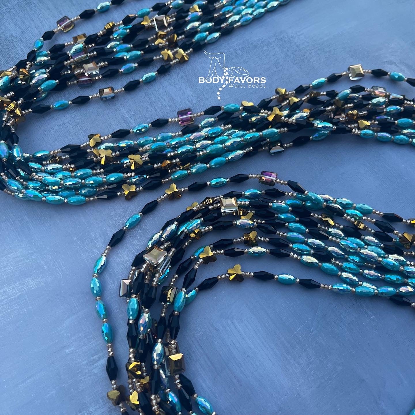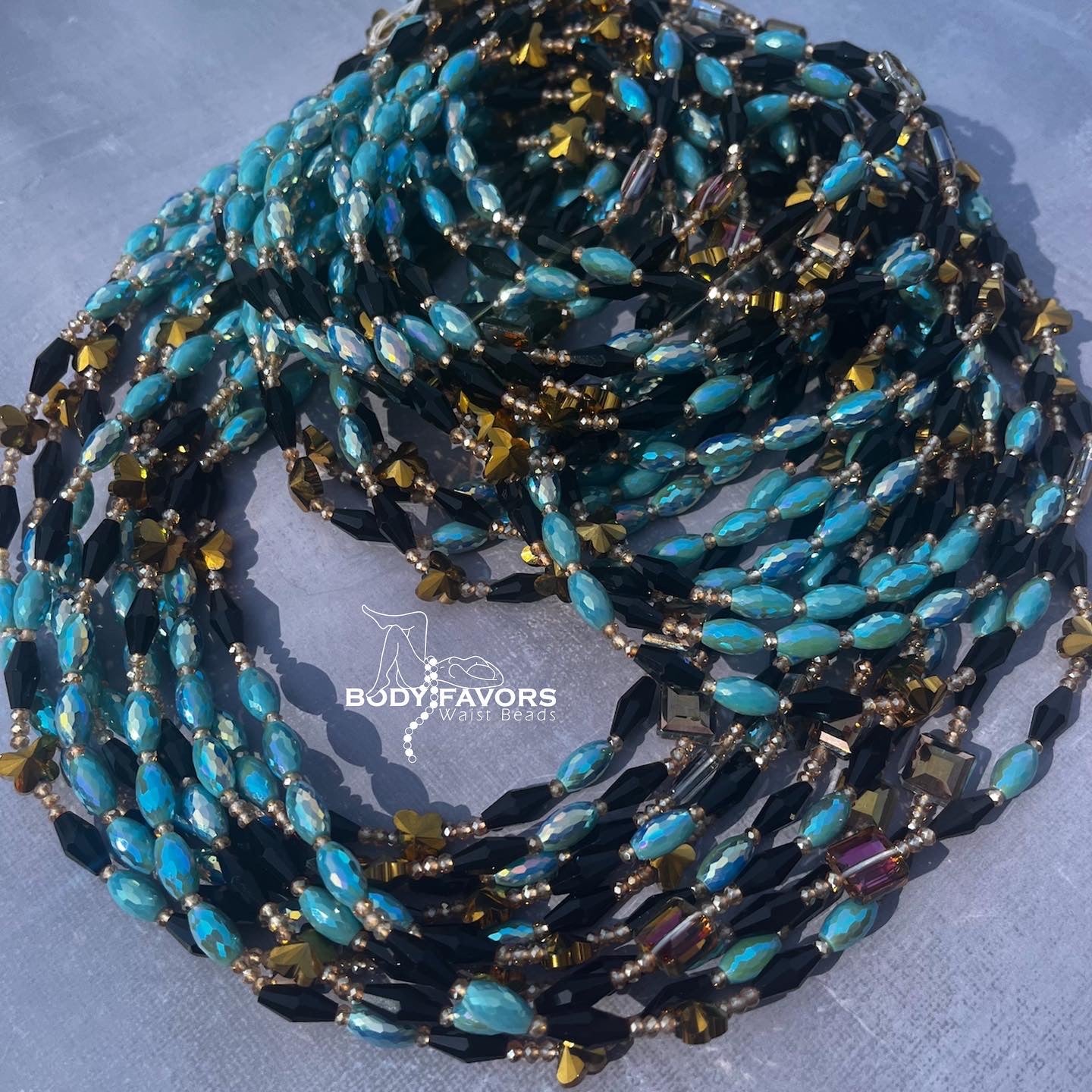 Colors: Gold, teal, and black crystal beads