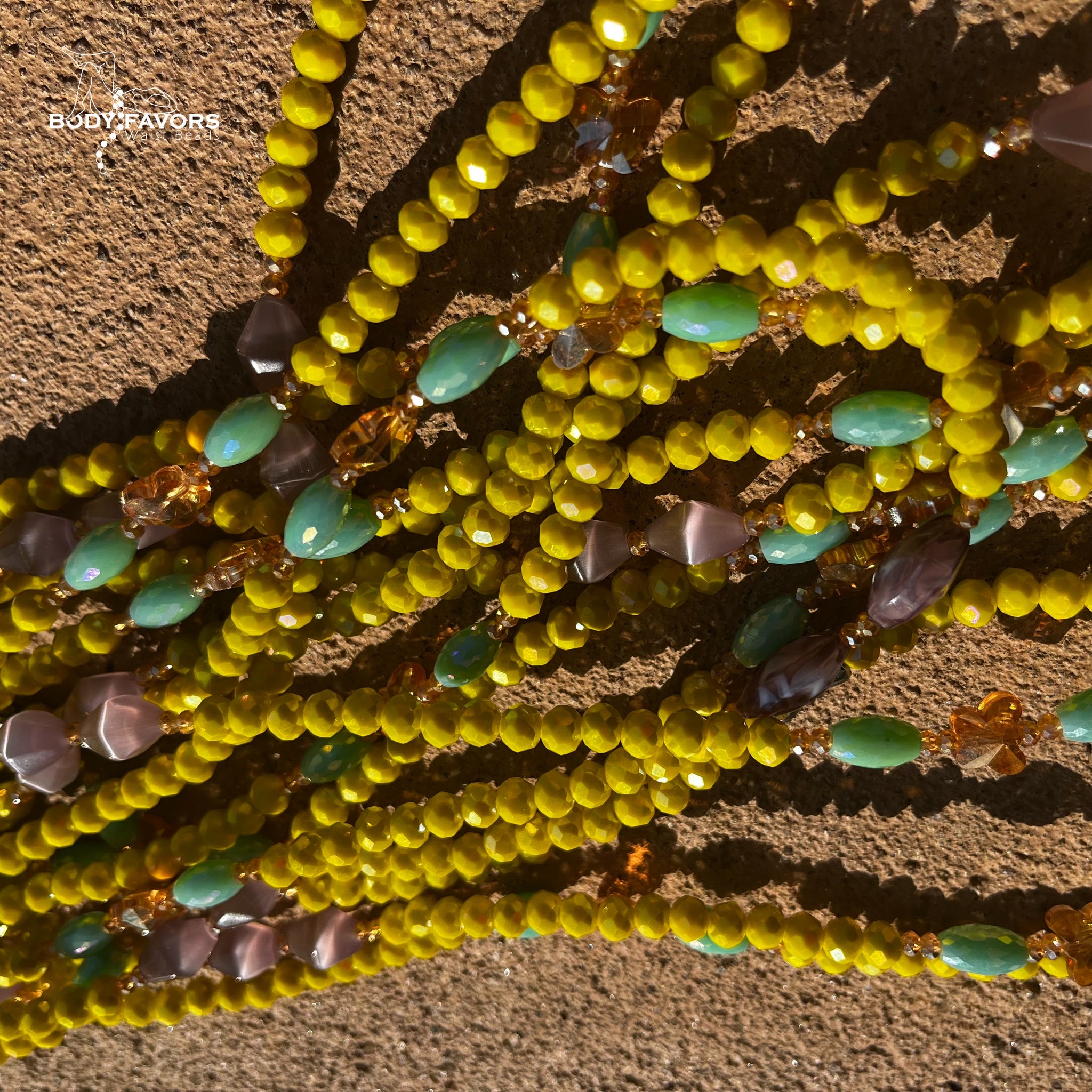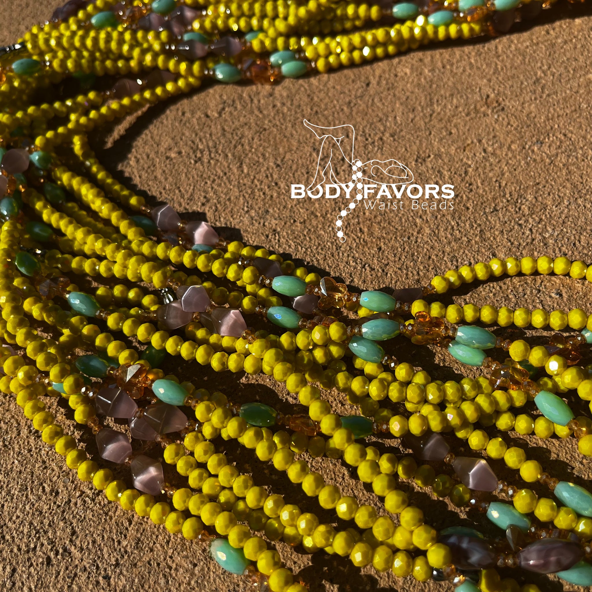 Highlighter yellow removable waist bead with purple diamond shaped bead with teal and cream butterfly accents.